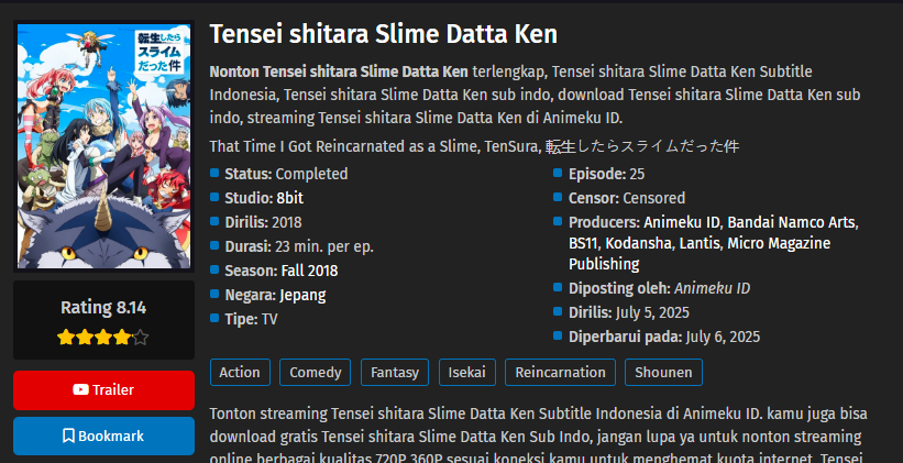 untuk tampilan series terdapat info anime,trailer,bookmark dan di bawahnya terdapat sinopsis,dan tampilan pilihan episode